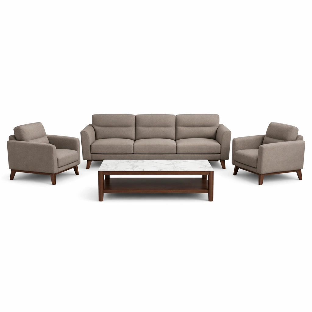 Conjunto de sofá en Tela Gris Topo con Mesa de Madera y Mármol