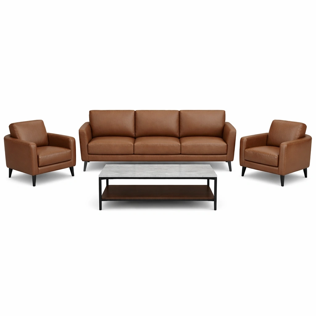 Conjunto de sofá de Tres Plazas y Dos Sillones de Cuero Sintético Marrón con Mesa de Centro de Mármol