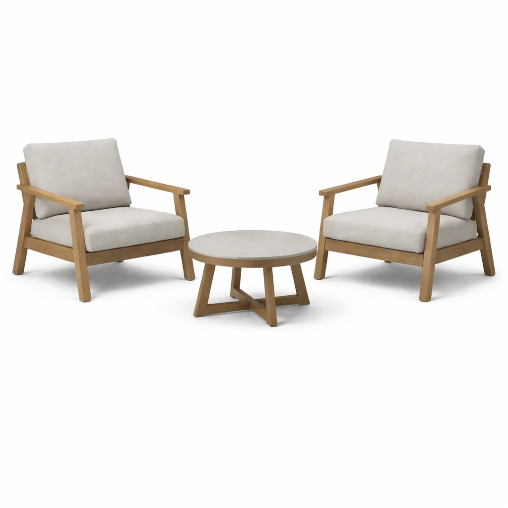 Material: Estructura de madera de teca, cojines de poliéster, tablero de mesa de cemento.