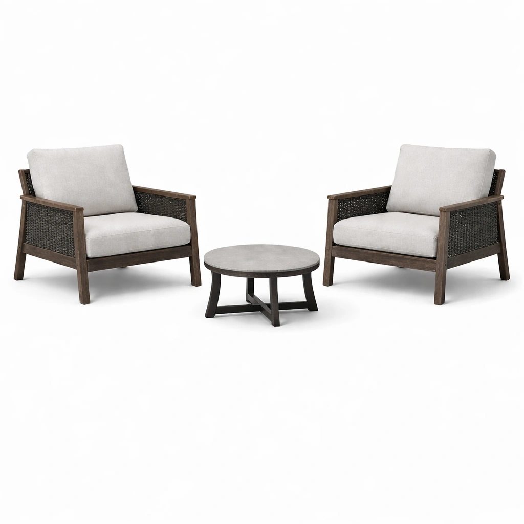 Este conjunto incluye 2 sillones y 1 mesa auxiliar. Los sillones están hechos de madera de acacia y ratán sintético, con cojines de poliéster rellenos de espuma de poliuretano. La mesa auxiliar también está fabricada en madera de acacia. Las dimensiones del sillón son Largo 80 cm, Ancho 75 cm, Alto 85 cm, mientras que la mesa tiene un diámetro de 50 cm y una altura de 40 cm.