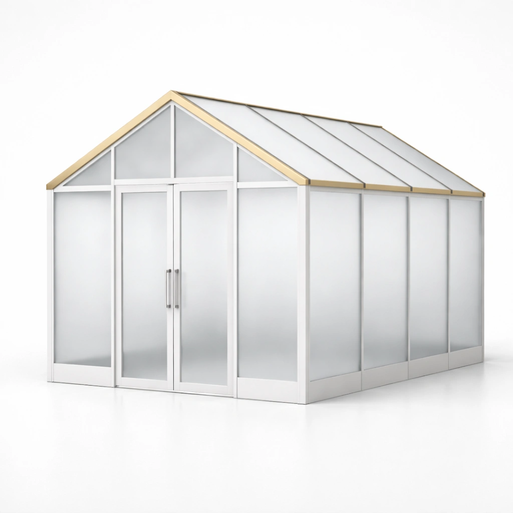 Invernadero fabricado con estructura de aluminio y paneles de policarbonato transparente de 6 mm de grosor, con techo dorado. Proporciona protección contra el clima y optimiza la luz solar. Incluye puertas correderas con manijas y diseño de techo a dos aguas. Dimensiones: 300cm de largo, 200cm de ancho y 250cm de alto. Capaz de resistir temperaturas desde -20°C hasta 60°C, con una transmisión de luz del 90%.