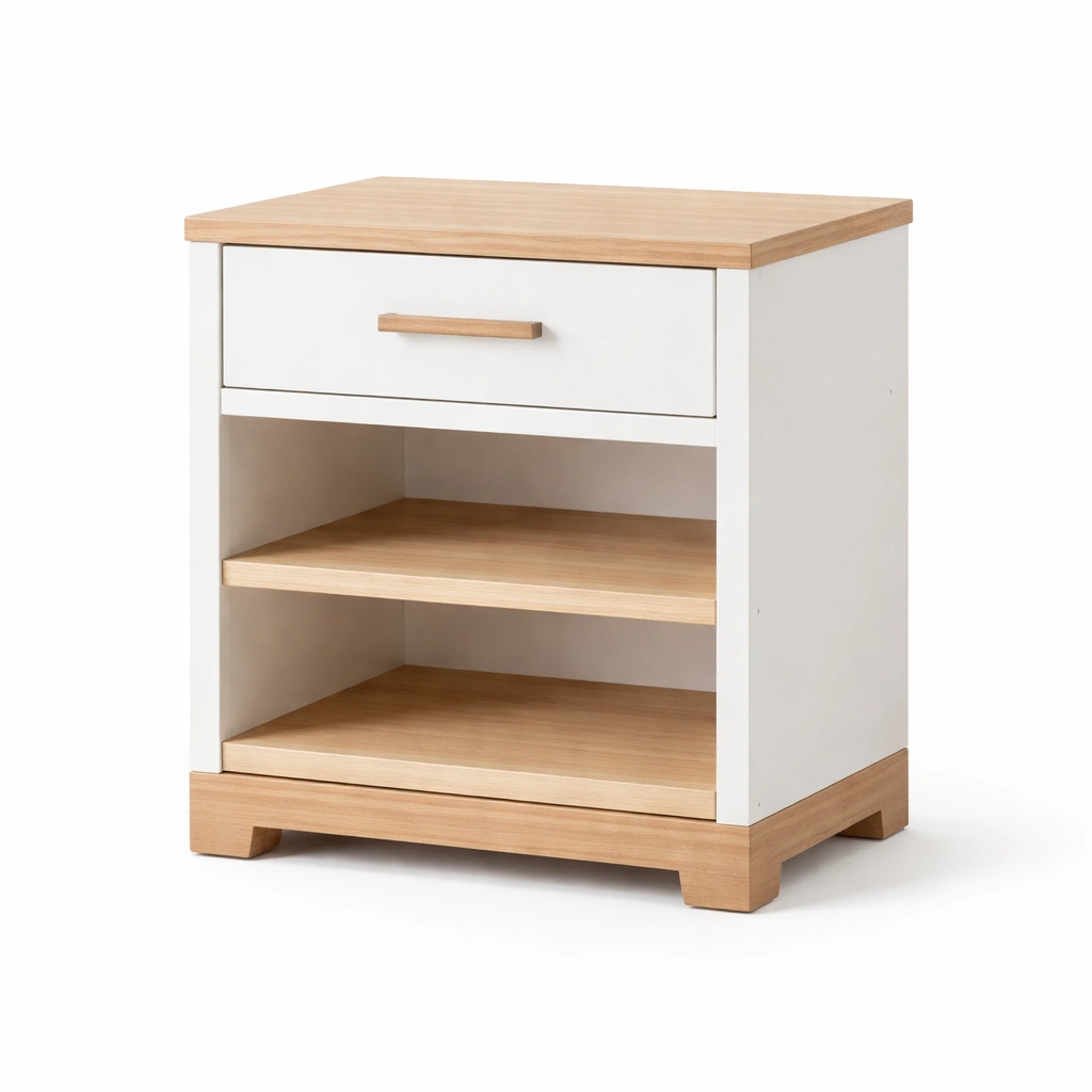 La mesita de noche está fabricada con MDF y chapado en madera natural. Incluye un cajón y dos estantes para almacenamiento.
