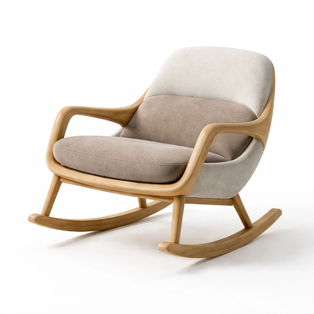 Esta mecedora está fabricada con un marco de madera de roble natural. El asiento está tapizado en tela de poliéster de dos colores: gris y beige. Sus dimensiones son 80 cm de largo, 70 cm de ancho y 90 cm de alto. El peso total es de 12 kg. Incluye una base deslizante para mecerse.